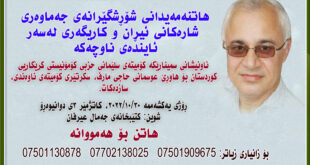 کۆمیتەی سلێمانی حزبی کۆمۆنیستی کرێکاریی کوردستان هەلدەستێت بەسازدانی کۆڕیک بۆ هاوڕی عوسمانی حاجی مارف سکرتێری کۆمیتەی ناوەندی ناونیشانی کۆڕەکە بریتیەلە: هاتنەمەیدانی شۆڕشگێرانەی جەماوەری شارەکانی ئیڕان و کاریگەری لەسەر ئایندەی ناوچەکە. هاتن بۆ هەموانە ڕۆژی یەکشەممە ٣٠/١٠/٢٠٢٢، کاتژمێر ٣ی دوانیوەڕۆ. شوین: کتێبخانەی جەمال عیرفان بۆ زانیاری زیاتر پەیوەندی بەم ژمارە تەلەفونانەوە …